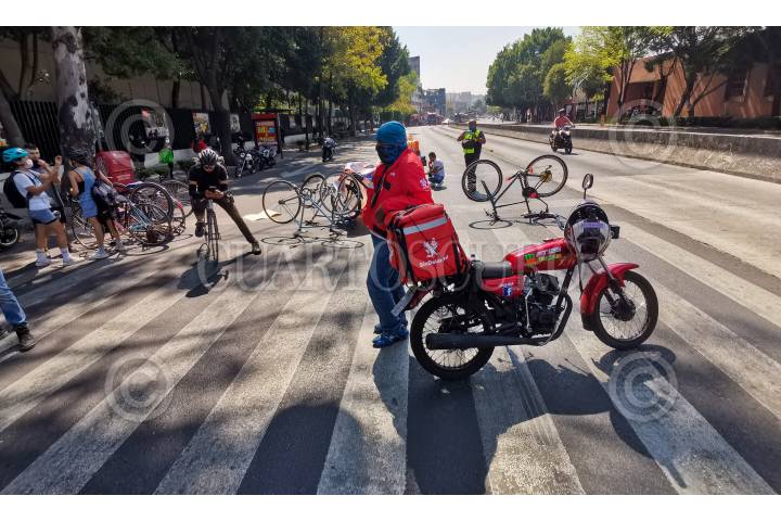CIUDAD DE MÉXICO, 11NOVIEMBRE2020.- Repartidores bloquearon Insurgentes, a la altura de la calle Luis Donald Colosio, para exigir justicia por su compañero Mario Trejo, quien fue atropellado el 5ñ6 de noviembre por una unidad del transporte público, en el desnivel de Eje 2 Norte e Insurgentes. Los inconformes señalan que a pesar de que ayer habían llegado un acuerdo con Semovi de que Mario iba ser trasladado a otra clínica, por que en la que actualmente está por una negligencia médica perdió la pierna. Además acusan que el responsable es un chófer que ya tiene varias denuncias de haber atropellado al menos a 6 personas sigue libre ya que no se le finco ninguna responsabilidad. La unidad involucrada pertenece a la ruta 1 del corredor Copesa y tiene el número 0012514. FOTO: MOISÉS PABLO/CUARTOSCURO.COM