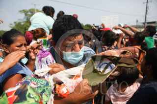 VILLAHERMOSA, TABASCO, 11NOVIEMBRE2020.- Un grupo de la sociedad civil reparte distintos artículos para personas damnificadas por las crecientes de las aguas en la colonia Gaviotas Sur. Los afectados entre empujones y arrebatos logran obtener lo que más pueden. FOTO: CARLOS CANABAL OBRADOR/CUARTOSCURO.COM
