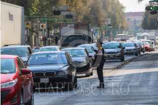 CIUDAD DE MÉXICO, 12NOVIEMBRE2020.- Ayer por la tarde la Comisión Ambiental de la Megalópolis (Came) activó la Fase 1 de contingencia por partículas suspendidas. Un policía dirige el tráfico en una fila interminable de autos en Eje Central. FOTO: MOISÉS PABLO/CUARTOSCURO.COM