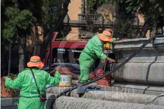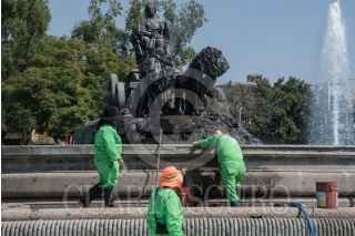 CIUDAD DE MÉXICO, 14NOVIEMBRE2020.- Trabajadores de infraestructura vial de la capital continúan con la limpieza de las pintas realizadas en la Fuente de Cibeles durante la manifestación feminista del pasado 11 de noviembre. FOTO: MARIO JASSO/CUARTOSCURO.COM