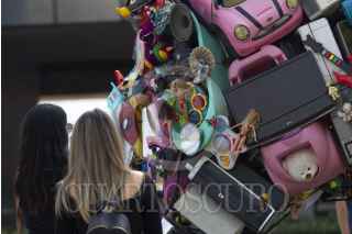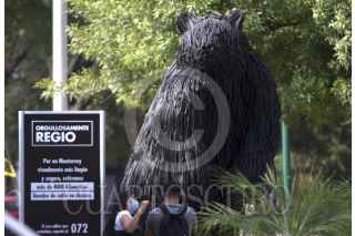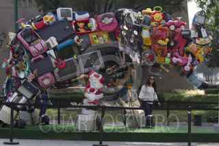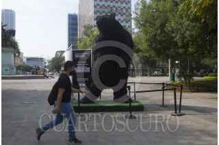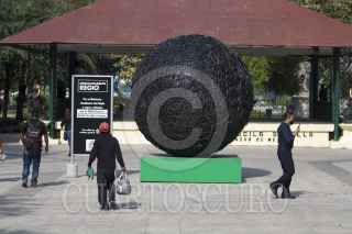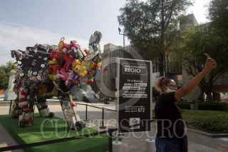 MONTERREY, NUEVO LEÓN, 14NOVIEMBRE2020.- Tres esculturas hechas con basura electrónica y material reciclable, fueron colocados en la Plaza Zaragoza por parte de Ecología de Monterrey. La figura de un oso de tres metros y una esfera están conformadas por más de 400 kilómetros de cables en desuso de postes, además de la forma de un elefante que mide más de tres metros, hecha con juguetes y material electrónico que pesa más de 40 mil elefantes asiáticos, para hacer conciencia del reciclaje y cultura ecológica en la ciudad. FOTO: GABRIELA PÉREZ MONTIEL / CUARTOSCURO.COM