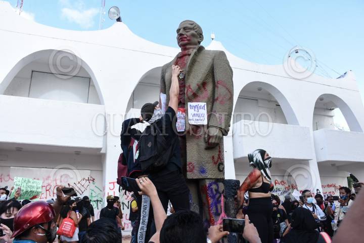 CANCÚN, QUINTANA ROO, 15NOVIEMBRE2020.- Mujeres marcharon para pedir justicia por el feminicidio de Bianca Alejandrina "Alexis" y por la represión policial que vivieron durante una manifestación en las inmediaciones del Palacio Municipal de Cancún. Durante la movilización pintaron la sede del edificio del ayuntamiento, monumentos y vehículos oficiales. FOTO: ELIZABETH RUIZ/CUARTOSCURO.COM