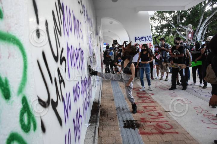 CANCÚN, QUINTANA ROO, 15NOVIEMBRE2020.- Mujeres marcharon para pedir justicia por el feminicidio de Bianca Alejandrina "Alexis" y por la represión policial que vivieron durante una manifestación en las inmediaciones del Palacio Municipal de Cancún. Durante la movilización pintaron la sede del edificio del ayuntamiento, monumentos y vehículos oficiales. FOTO: ELIZABETH RUIZ/CUARTOSCURO.COM