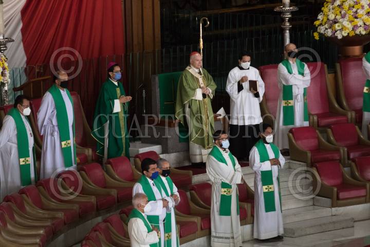CIUDAD DE MÉXICO, 14NOVIEMBRE2020.- El Arzobispo Primado de México, Carlos Aguiar Retes, encabezó la homilía en la Basílica de Guadalupe, la cual albergó un aforo limitado de personas. Aunque falta poco más de tres semanas para los festejos guadalupanos del 12 de diciembre peregrinos de diferentes estados de la República ya empezaron a visitar el santuario. FOTO: MOISÉS PABLO/CUARTOSCURO.COM
