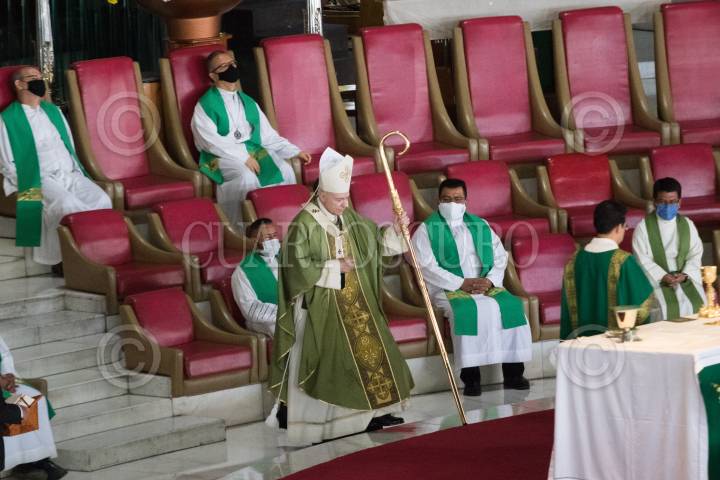 CIUDAD DE MÉXICO, 14NOVIEMBRE2020.- El Arzobispo Primado de México, Carlos Aguiar Retes, encabezó la homilía en la Basílica de Guadalupe, la cual albergó un aforo limitado de personas. Aunque falta poco más de tres semanas para los festejos guadalupanos del 12 de diciembre peregrinos de diferentes estados de la República ya empezaron a visitar el santuario. FOTO: MOISÉS PABLO/CUARTOSCURO.COM
