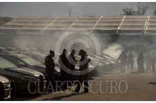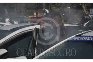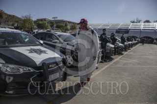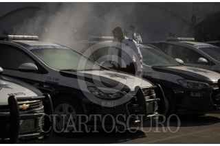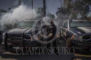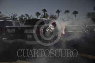 TIJUANA, BAJA CALIFORNIA, 16NOVIEMBRE2020.- Unidades de la Policía Municipal fueron desinfectadas para evitar riesgos de contagios masivos de Covid-19 entre los oficiales. Durante la mañana fueron desinfectadas 100 unidades patrullas y 100 moticicletas, que forman parte de la flotilla de la corporación. Desde que inició la pandemia han muerto 11 oficiales de la Policia Municipal después de haberse contagiado de coronavirus. FOTO: OMAR MARTÍNEZ /CUARTOSCURO.COM