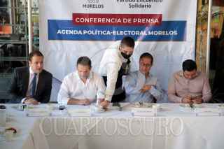 CUERNAVACA, MORELOS, 17NOVIEMBRE2020.- Conferencia de prensa de Jorge Arguelles, diputado federal del Partido Encuentro Social y presidente estatal del mismo, Hugo Eric Flores Cervantes, presidente nacional del partido Encuentro Solidario y Ulises Bravo Molina, presidente estatal de Encuentro Solidario. Ulises Bravo es hermano del gobernador, Cuauhtémoc Bravo, y fue recientemente nombrado presidente estatal. Hoy aseguro en materia de seguridad no vive un infierno. FOTO: MARGARITO PÉREZ RETANA /CUARTOSCURO.COM