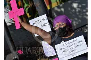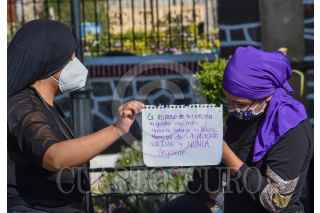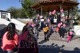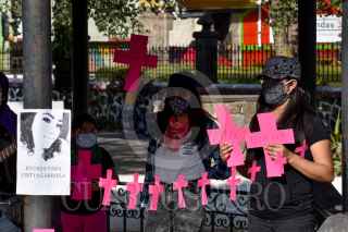 SAN ANTONIO LA ISLA, ESTADO DE MÉXICO, 18NOVIEMBRE2020.- Un grupo de mujeres se manifestaron en contra de los feminicidios en San Antonio la Isla, después de que en días pasados se diera el asesinato de una joven en el fraccionamiento Rancho San Dimas, levantaron la voz por todas las mujeres muertas en los últimos días, colocaron cruces rosas y un tendedero de denuncias en el kiosko para pedir justicia y mayor seguridad en este municipio. FOTO: CRISANTA ESPINOSA AGUILAR /CUARTOSCURO.COM