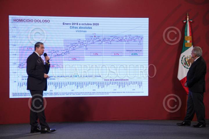 CIUDAD DE MÉXICO, 19NOVIEMBRE2020.- Andrés Manuel López Obrador, presidente de México acompañado de Marcelo Ebrard Casaubon, secretario de Relaciones Exteriores; Ricardo Mejía Berdeja, subsecretario de Seguridad Pública y encargado del despacho titular de la Secretaría de Seguridad y Protección Ciudadana (SSPC); Luis Cresencio Sandoval Gónzalez, secretario de la Defensa Nacional; José Rafael Ojeda Durán, secretario de Marina y Luis Rodríguez Bucio, comandante de la Guardia Nacional durante la conferencia de prensa en Palacio Nacional destacando el tema de seguridad del país. FOTO: ANDREA MURCIA /CUARTOSCURO.COM