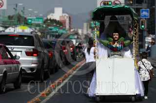 CIUDAD DE MÉXICO, 19NOVIEMBRE2020.- Sobre el carril exclusivo del RTP, una mujer y un niño transportan una imagen de la Santa Muerte y de Malverde rebasando a los coches que permanecen estacionado en los semáforos de Eje Central. FOTO: GALO CAÑAS/CUARTOSCURO.COM