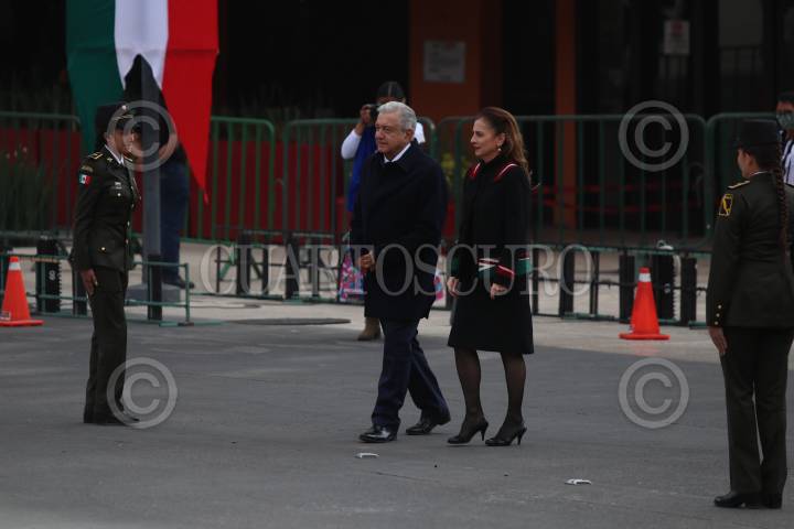 CIUDAD DE MÉXICO, 20NOVIEMBRE2020.- El presidente Andrés Manuel López Obrador encabezó la teatralización con motivo del 110 aniversario del inicio de la Revolución Mexicana en el Monumento a la Revolución. El mandatario acompañado de la investigadora y esposa Beatriz Gutiérrez Müller, así como de los secretarios de la SEDENA, Luis Cresencio Sandoval, y SEMAR, Rafael Ojeda, presenció el desfile que se realizó a puerta cerrada y reducido en elementos que participaron debido a la pandemia por Covid-19. FOTO: GALO CAÑAS/CUARTOSCURO.COM