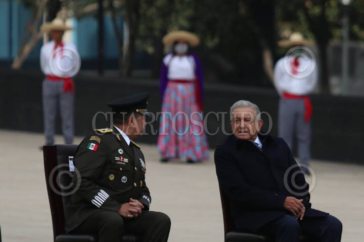 CIUDAD DE MÉXICO, 20NOVIEMBRE2020.- El presidente Andrés Manuel López Obrador encabezó la teatralización con motivo del 110 aniversario del inicio de la Revolución Mexicana en el Monumento a la Revolución. El mandatario acompañado de la investigadora y esposa Beatriz Gutiérrez Müller, así como de los secretarios de la SEDENA, Luis Cresencio Sandoval, y SEMAR, Rafael Ojeda, presenció el desfile que se realizó a puerta cerrada y reducido en elementos que participaron debido a la pandemia por Covid-19. FOTO: GALO CAÑAS/CUARTOSCURO.COM