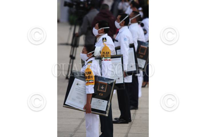 CIUDAD DE MÉXICO, 20NOVIEMBRE2020.- El presidente Andrés Manuel López Obrador encabezó la teatralización con motivo del 110 aniversario del inicio de la Revolución Mexicana en el Monumento a la Revolución. El mandatario acompañado de la investigadora y esposa Beatriz Gutiérrez Müller, así como de los secretarios de la SEDENA, Luis Cresencio Sandoval, y SEMAR, Rafael Ojeda, presenció el desfile que se realizó a puerta cerrada y reducido en elementos que participaron debido a la pandemia por Covid-19. FOTO: GALO CAÑAS/CUARTOSCURO.COM
