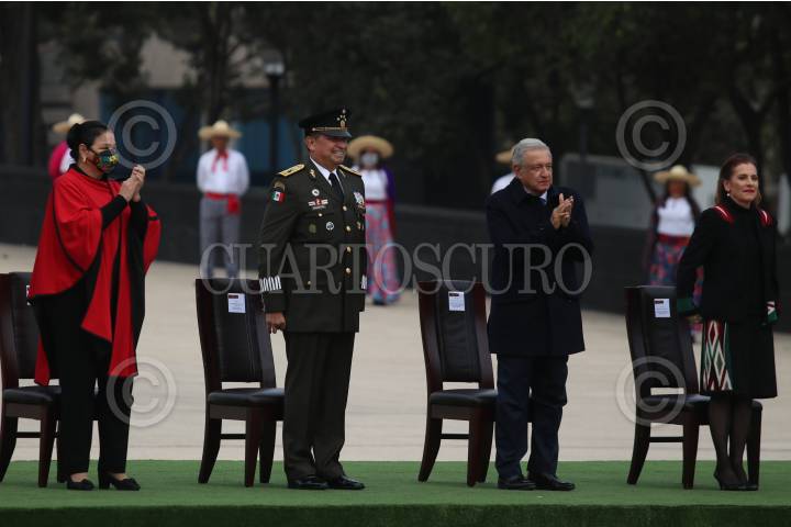CIUDAD DE MÉXICO, 20NOVIEMBRE2020.- El presidente Andrés Manuel López Obrador encabezó la teatralización con motivo del 110 aniversario del inicio de la Revolución Mexicana en el Monumento a la Revolución. El mandatario acompañado de la investigadora y esposa Beatriz Gutiérrez Müller, así como de los secretarios de la SEDENA, Luis Cresencio Sandoval, y SEMAR, Rafael Ojeda, presenció el desfile que se realizó a puerta cerrada y reducido en elementos que participaron debido a la pandemia por Covid-19. FOTO: GALO CAÑAS/CUARTOSCURO.COM