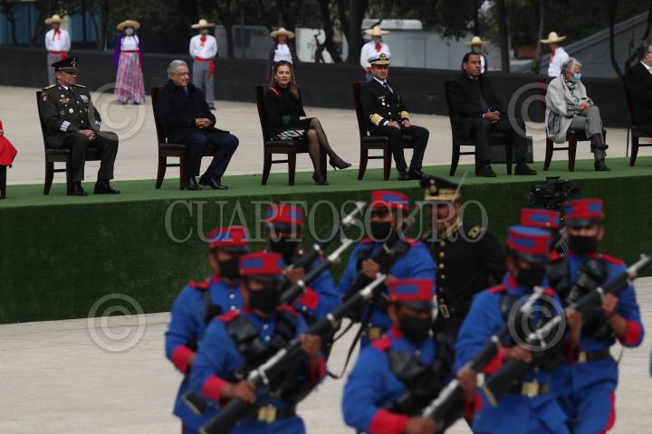 CIUDAD DE MÉXICO, 20NOVIEMBRE2020.- El presidente Andrés Manuel López Obrador encabezó la teatralización con motivo del 110 aniversario del inicio de la Revolución Mexicana en el Monumento a la Revolución. El mandatario acompañado de la investigadora y esposa Beatriz Gutiérrez Müller, así como de los secretarios de la SEDENA, Luis Cresencio Sandoval, y SEMAR, Rafael Ojeda, presenció el desfile que se realizó a puerta cerrada y reducido en elementos que participaron debido a la pandemia por Covid-19. FOTO: GALO CAÑAS/CUARTOSCURO.COM