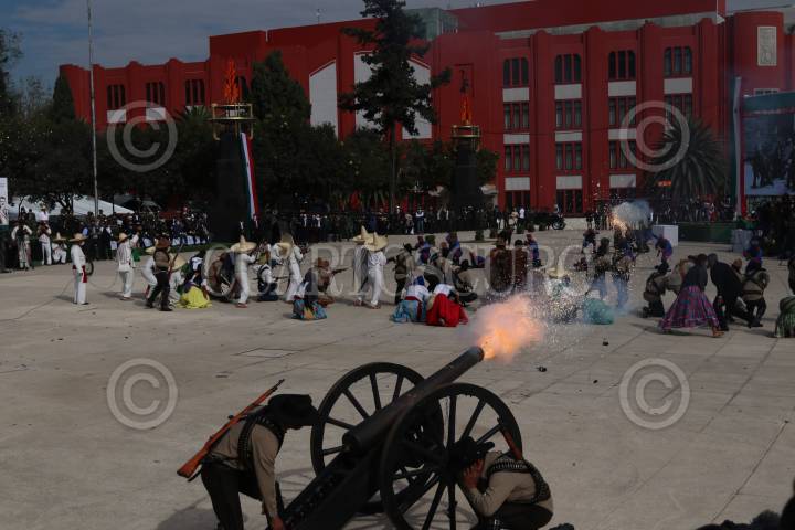 CIUDAD DE MÉXICO, 20NOVIEMBRE2020.- El presidente Andrés Manuel López Obrador encabezó la teatralización con motivo del 110 aniversario del inicio de la Revolución Mexicana en el Monumento a la Revolución. El mandatario acompañado de la investigadora y esposa Beatriz Gutiérrez Müller, así como de los secretarios de la SEDENA, Luis Cresencio Sandoval, y SEMAR, Rafael Ojeda, presenció el desfile que se realizó a puerta cerrada y reducido en elementos que participaron debido a la pandemia por Covid-19. FOTO: GALO CAÑAS/CUARTOSCURO.COM