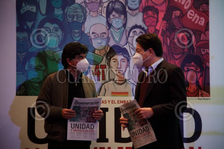 CIUDAD DE MÉXICO, 20NOVIEMBRE2020.- Mario Delgado, presidente del Partido político Morena; Jorge Gómez, director periódico Regeneración; Citlalli Hernández Mora secretaria general comité ejecutivo Nacional y Jesús Ramírez, fundador del periódico Regeneración, durante la presentación del periódico Regeneración. FOTO: ANDREA MURCIA /CUARTOSCURO.COM