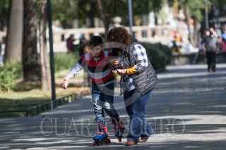 CIUDAD DE MÉXICO, 22NOVIEMBRE2020.- Una abuela ayuda a su nieto a aprender en patines en la Alameda Central. FOTO: MOISÉS PABLO/CUARTOSCURO.COM