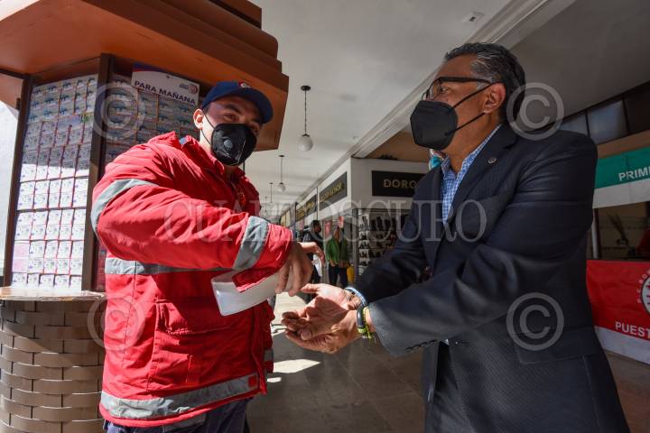 TOLUCA, ESTADO DE MÉXICO, 23NOVIEMBRE2020.- Autoridades estatales realizan un llamado a la población para seguir las medidas sanitarias y evitar aumente el número de contagios por COVID-19, lavarse las manos, usar cubrebocas, gel antibacterial, para ello personal de Bomberos de Toluca regalan gel antibacterial a las personas que pasan por los Portales de Toluca y los invitan a portar de forma correcta el cubrebocas. FOTO: CRISANTA ESPINOSA AGUILAR /CUARTOSCURO. COM