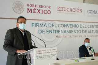 TLAXCALA, MÉXICO, 24NOVIEMBRE2020.- El Instituto Mexicano del Seguro Social (IMSS), el gobierno de Tlaxcala, y la Comisión Nacional del Deporte (CONADE) firmaron un convenio para la implementación del Centro Internacional de Entrenamiento de Altura "La Malintzi" en el Centro Vacacional del IMSS en la entidad, con el fin de fomentar la recreación, fortalecer la cohesión familiar y social, el sano esparcimiento e incentivar la inversión y el turismo. El convenio fue suscrito por el gobernador de Tlaxcala, Marco Antonio Mena Rodríguez; la titular de la CONADE, Ana Gabriela Guevara; el secretario general del IMSS, Javier Guerrero García, en representación del director general, Maestro Zoé Robledo; y por el coordinador sectorial de Proyectos Estratégicos Presupuestales de la Unidad de Administración y Finanzas de la SEP, José Ángel González Arreola. FOTO: IMSS/CUARTOSCURO.COM