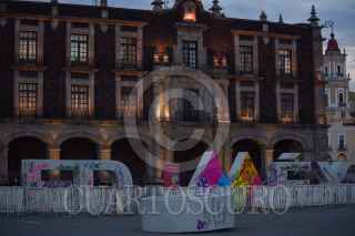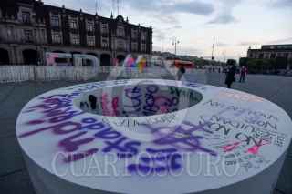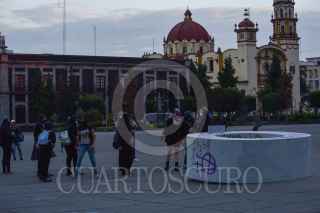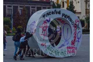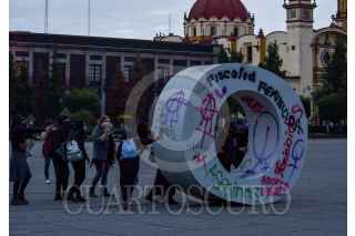 TOLUCA, ESTADO DE MÉXICO, 25NOVIEMBRE2020.- Un grupo de feministas pintaron y rodaron la letra “O” de las letras del Estado de México que se encuentran en la Plaza de los Mártires en Toluca. FOTO: CRISANTA ESPINOSA AGUILAR /CUARTOSCURO.COM