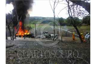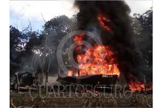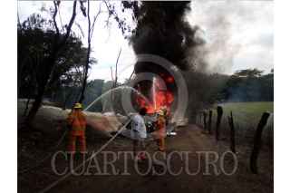 TRINITARIA, CHIAPAS, 26NOVIEMBRE2020.- Una pipa que transportaba gasolina de contrabando, se incendió en la línea fronteriza entre México y Guatemala, en el punto donde se comercializa para su venta en expendios callejeros en Chiapas. Lugareños cerraron las vías de acceso y únicamente permitieron el ingreso de cuerpos de Bomberos de Protección Civil. FOTO: TOÑO AGUILAR/CUARTOSCURO.COM