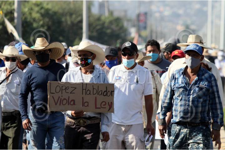 AYALA, MORELOS, 28NOVIEMBRE2020.- Para conmemorar el 109 aniversario de la promulgación del Plan de Ayala, campesinos, ejidatarios, ciudadanos, indígenas otomíes, así como organizaciones campesinas marcharon desde las oficinas de la Asociación de Usuarios del Río Cuautla hasta el Señor del Pueblo, donde realizaron un mitin, para después continuar su protesta hasta el acceso del poblado de San Pedro Apatlaco. En ese sitio, que está bloqueado desde el lunes por vallas metálicas y cientos de elementos de la Guardia Nacional, los campesinos realizaron otro mitin y se suscitó un pequeño connato de enfrentamiento que fue controlado por los líderes. La Comisión Federal de Electricidad construye en la ribera del río Cuautla un acueducto que llevará agua para enfriar la termoeléctrica, a lo cual se oponen los ejidatarios de la región. FOTO: MARGARITO PÉREZ RETANA/CUARTOSCURO.COM