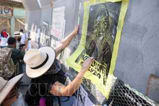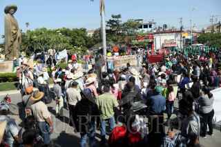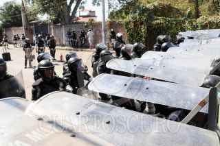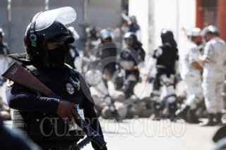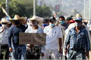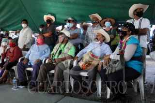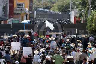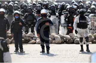 AYALA, MORELOS, 28NOVIEMBRE2020.- Para conmemorar el 109 aniversario de la promulgación del Plan de Ayala, campesinos, ejidatarios, ciudadanos, indígenas otomíes, así como organizaciones campesinas marcharon desde las oficinas de la Asociación de Usuarios del Río Cuautla hasta el Señor del Pueblo, donde realizaron un mitin, para después continuar su protesta hasta el acceso del poblado de San Pedro Apatlaco. En ese sitio, que está bloqueado desde el lunes por vallas metálicas y cientos de elementos de la Guardia Nacional, los campesinos realizaron otro mitin y se suscitó un pequeño connato de enfrentamiento que fue controlado por los líderes. La Comisión Federal de Electricidad construye en la ribera del río Cuautla un acueducto que llevará agua para enfriar la termoeléctrica, a lo cual se oponen los ejidatarios de la región. FOTO: MARGARITO PÉREZ RETANA/CUARTOSCURO.COM