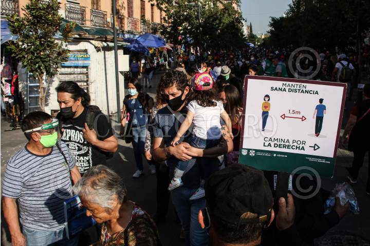 CIUDAD DE MÉXICO, 28NOVIEMBRE2020.- Continúan las grandes concentraciones de personas en las calles del centro histórico, esto pese a continuar activo semáforo epidemiológico en color naranja con alerta a cambio color rojo, debido a la pandemia de Covid-19. FOTO: ROGELIO MORALES /CUARTOSCURO.COM