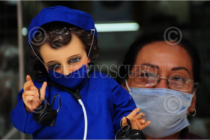 CIUDAD DE MÉXICO, 05DICIEMBRE2020.- Con el objetivo de consientizar a los habitantes de la capital en torno a la situación que se vive por la pandemia de Covid-19, la fábrica Niños Uribe que se encarga de vestir y fabricar estas figuras religiosas colocó en algunas de estas piezas cubrebocas y caretas, esperan que la gente entienda la importancia del uso de estos elementos para cortar los contagios del virus y salir de la crisis lo más pronto posible. FOTO: DANIEL AUGUSTO /CUARTOSCURO.COM