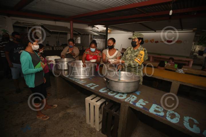 MACUSPANA, TABASCO, 02DICIEMBRE2020.- Elementos de la Cocina Comunitaria de SEDENA, que consta de 15 cocineros se encuentran apoyando en las contingencias por inundación a la comunidad civil, donde dotan de alimentación a 22 albergues, con un racionamiento diario de 6405 platillos con comida caliente, siendo hasta la fecha repartidas 122049 raciones. De la misma manera indicaron que cada alimentación consta de agua fresca, sopa de pasta, arroz, guisado ya sea de res, cerdo o pollo, tortillas y postre, repartiéndose en los tres tercios; desayuno, comida y cena. FOTO: CARLOS CABAL OBRADOR/CUARTOSCURO.COM