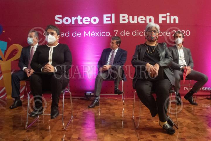 CIUDAD DE MÉXICO, 07DICIEMBRE2020.- Francisco Cervantes Díaz, presidente de la Concamin, Raquel Buenrostro, titular del SAT; Graciela Márquez Colín, secretaria de Economía, y José Manuel Campos, líder de la Concanaco-Servitur, durante el Sorteo de El Buen Fin que organiza el SAT, el cual repartió una bolsa de 500 millones de pesos, los ganadores fueron todos aquellos que realizaron compras a partir de 250 pesos con tarjetas bancarias en los días del 9 al 20 de noviembre de este año. FOTO: MOISÉS PABLO/CUARTOSCURO.COM