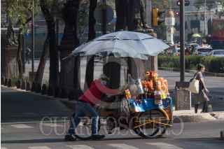 CIUDAD DE MÉXICO, 08DICIEMBRE2020.- Un vendedor de raspados y frituras empuja su carrito sobre avenida Reforma recién inicia la jornada. FOTO: MOISÉS PABLO/CUARTOSCURO.COM