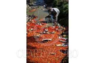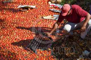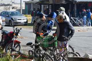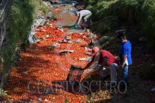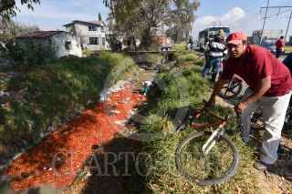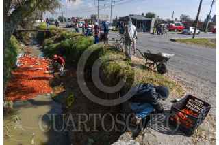 TOLUCA, ESTADO DE MÉXICO, 08DICIEMBRE2020.- Pobladores de San Andrés Cuexcontitlán recogieron jitomate que transportaba un camión que se accidentó en la avenida Revolución, su carga terminó en un canal de aguas sucias. FOTO: CRISANTA ESPINOSA AGUILAR /CUARTOSCURO.COM