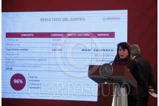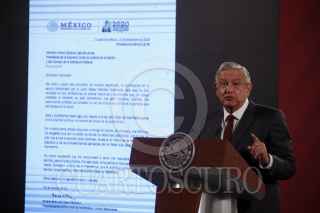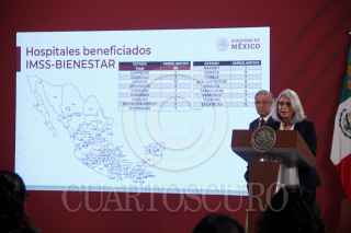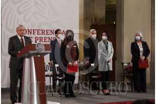 CIUDAD DE MÉXICO, 11DICIEMBRE2020.- Andrés Manuel López Obrador, presidente de México, acompañado de Gisela Lara Saldaña, titular de la Unidad del Programa IMSS-Bienestar; Galia Borja Gómez, tesorera de la Federación; Margarita González Sarabia, directora general de la Lotería Nacional para la Asistencia Pública; Jorge Mendoza Sánchez, director general de Banobras y Ernesto Prieto Ortega, director general del Instituto para Devolver al Pueblo lo Robado (Indep), durante la conferencia matutina en Palacio Nacional. FOTO: ANDREA MURCIA /CUARTOSCURO.COM