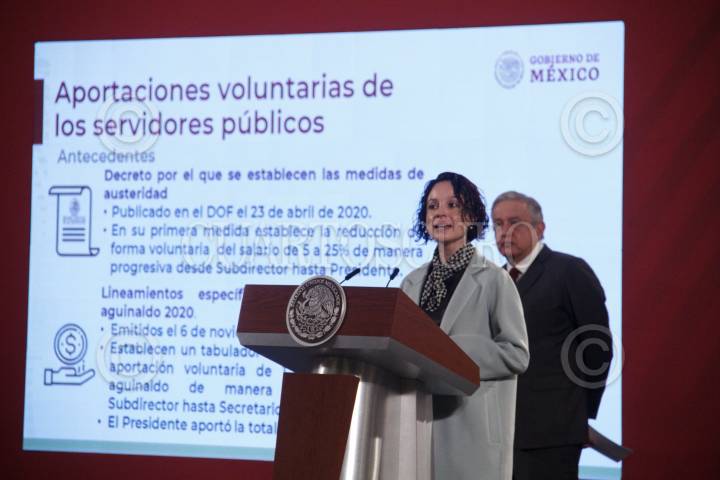 CIUDAD DE MÉXICO, 11DICIEMBRE2020.- Andrés Manuel López Obrador, presidente de México, acompañado de Gisela Lara Saldaña, titular de la Unidad del Programa IMSS-Bienestar; Galia Borja Gómez, tesorera de la Federación; Margarita González Sarabia, directora general de la Lotería Nacional para la Asistencia Pública; Jorge Mendoza Sánchez, director general de Banobras y Ernesto Prieto Ortega, director general del Instituto para Devolver al Pueblo lo Robado (Indep), durante la conferencia matutina en Palacio Nacional. FOTO: ANDREA MURCIA /CUARTOSCURO.COM