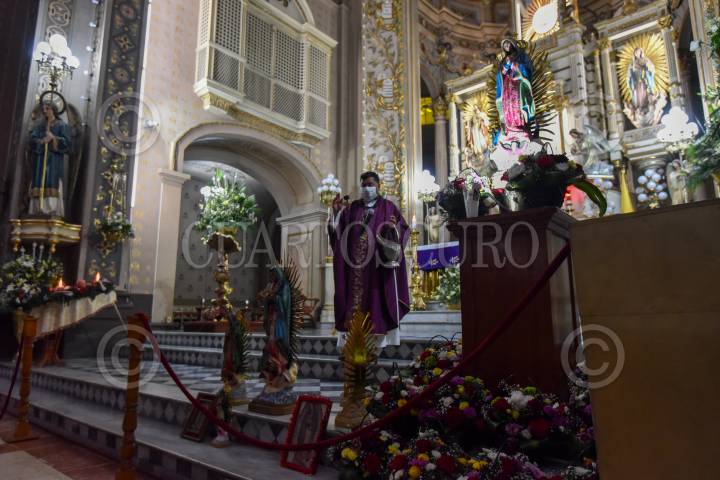 TOLUCA, ESTADO DE MÉXICO, 11DICIEMBRE2020.- Fieles católicos acudieron a la iglesia de la Santa Veracruz en Toluca a escuchar misa en honor a la Virgen de Guadalupe, ante la prohibición de festejos por la contingencia por COVID-19, se invita a los creyentes a permanecer en sus casas y no realizar reuniones masivas con motivo de los festejos de la Virgen morena. FOTO: CRISANTA ESPINOSA AGUILAR /CUARTOSCURO.COM