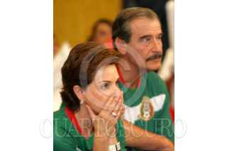 MÉXICO D.F. 21JUNIO2006.- El presidente Vicente Fox, acompañado de su esposa Marta Sahagun, lamentan la falla del penalti, durante la transmisión del juego de la selección nacional contra de Portugal. FOTO: Guillermo Perea/CUARTOSCURO.COM