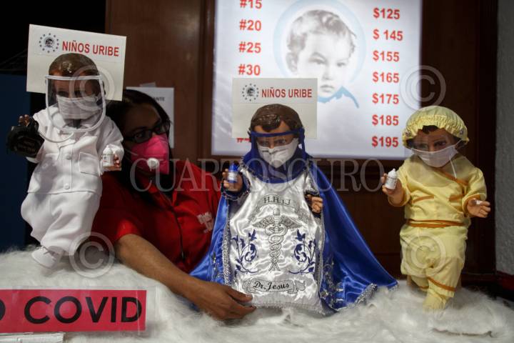 CIUDAD DE MÉXICO, 12DICIEMBRE2020.- Con el propósito de hacer un homenaje al personal médico y también que los creyentes recuerden la importancia del uso de cubrebocas, careta y gel de manera cotidiana, la empresa de Niños Uribe tiene en sus vitrinas el tradicional Niño Dios pero ahora con cubrebocas, careta y también con traje de médico. La calle niño Dios ubicada en el Centro Histórico es la fecha donde más se concurre, pero este año para evitar aglomeraciones han cerrado algunos locales y los que permanecen abiertos tienen medidas sanitarias para el personal y clientes. FOTO: ANDREA MURCIA / CUARTOSCURO.COM