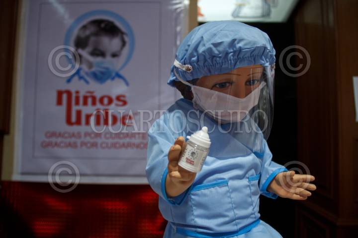 CIUDAD DE MÉXICO, 12DICIEMBRE2020.- Con el propósito de hacer un homenaje al personal médico y también que los creyentes recuerden la importancia del uso de cubrebocas, careta y gel de manera cotidiana, la empresa de Niños Uribe tiene en sus vitrinas el tradicional Niño Dios pero ahora con cubrebocas, careta y también con traje de médico. La calle niño Dios ubicada en el Centro Histórico es la fecha donde más se concurre, pero este año para evitar aglomeraciones han cerrado algunos locales y los que permanecen abiertos tienen medidas sanitarias para el personal y clientes. FOTO: ANDREA MURCIA / CUARTOSCURO.COM