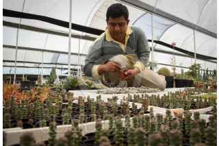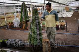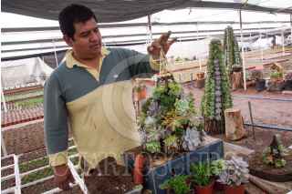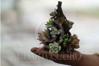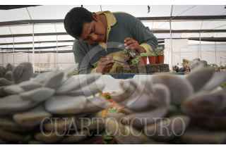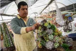 CIUDAD DE MÉXICO, 12DICIEMBRE2020.- La familia Jiménez desde hace 10 se dedican a la producción de plantas sacras mejor conocidas como "suculentas" en la región de San Luis Tlaxialtemalco en Xochimilco. Durante el inicio de la pandemia sanitaria por covid-19 la venta disminuyeron entre un 80 y 90 por ciento, por lo que se tuvieron que adaptar a las circunstancias e idear nuevos productos así como el uso constante de redes sociales. Israel Jiménez, productor y artesano mediante la combinación de colores característicos de las plantas comenzó con la elaboración de árboles de suculentas de varios tipos de tamaños que van desde los 10 centímetros hastas los 2 metros, con precios de 200 pesos a 10 mil pesos respectivamente. La estructura cónica es realizada con "jarilla" que se obtiene del bejuco, y es importado desde Iguala, Guerrero. Los pedidos pueden ser realizados mediante las redes sociales con el nombre "Invernaderos Suculentos Jiménez" o bajo pedido en el corredor agroecológico en donde los turistas pueden comprar directamente los productos en el invernadero. FOTO: MARIO JASSO/CUARTOSCURO.COM
