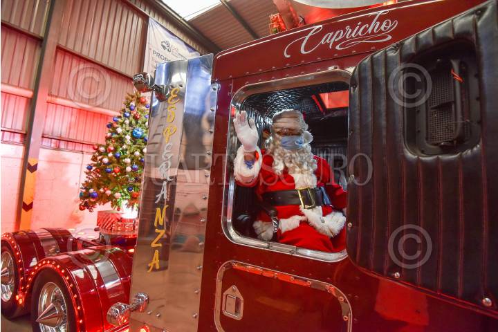 TOLUCA, ESTADO DE MÉXICO, 16DICIEMBRE2020.- Santa Claus se encuentra recorriendo algunas avenidas de la capital mexiquense en un tracto camión llamado “Capricho” modelo 1979 y modificado el cual ha sido adornado con un árbol de Navidad, regalos y luces, propiedad de la empresa Exe Logística; de acuerdo a Josué Cruz, director de esta empresa, salen por las noches para dar un momento de alegría, ilusión y felicidad, a todas las personas que se encuentran en el camino y cómo una forma de rendir un homenaje a los hombres del transporte de carga, hombres camión y todos aquellos que trabajan en el rubro del transporte, ya que durante esta pandemia continuaron su labor de todo corazón, apoyando a la población. Respetando todas las medidas higiénicas el tractocamión navideño no se detiene y Santa Claus solo saluda de lejos a las personas, las rutas no son difundidas para evitar aglomeraciones en tiempos de COVID-19, los recorridos son dos veces a la semana durante el mes de diciembre a partir de las 6 de la tarde solo en el municipio de Toluca, siendo la primera vez que lo realizan esperan que en próximos años puedan abarcar otros municipios. FOTO: CRISANTA ESPINOSA AGUILAR /CUARTOSCURO.COM