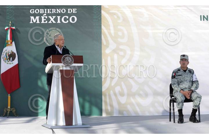MOCTEZUMA, SONORA, 16DICIEMBRE2020.- Andrés Manuel López Obrador, Presidente Constitucional de los Estados Unidos Mexicanos, durante la Inauguración de las instalaciones de la “Compañía de la Guardia Nacional”. Lo acompañaron Luis Rodríguez Bucio, comandante de la Guardia Nacional; Benedicto Santa María González, coordinador estatal de la Guardia Nacional; General Luis Cresencio Sandoval González, secretario de la Defensa Nacional; Jorge Ambia Minero, comandante de la 4/a Zona Militar; Claudia Artemiza Pavlovich Arellano, gobernadora Constitucional del Estado de Sonora; Cruz Adriana Sepúlveda Rodríguez, presidenta municipal de Moctezuma, Sonora; Ricardo Mejía Bardeja, subsecretario de Seguridad Pública; Jesús Ramírez Cuevas, Coordinador General de Comunicación Social y Vocero del Gobierno de México; Almirante José Rafael Ojeda Durán, secretario de Marina y Celestino Ávila Astudillo, comandante De la ll Región Militar. FOTO: PRESIDENCIA/CUARTOSCURO.COM