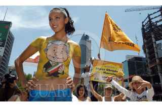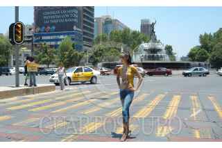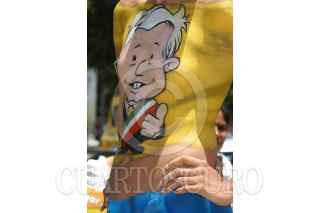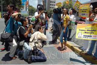 MEXICO D.F. 27JUNIO2006.- Jazmin Bustamante, participo en la acción ¨Pintándose a la Victoria¨, que se realizo en la glorieta de la Diana Cazadora en apoyo al candidato presidencial de la coalición Por el bien de todos. La joven modelo lucio su cuerpo una imagen pintada de abanderado perredista. FOTO:Germán Romero/CUARTOSCURO.COM