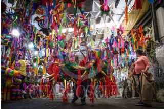 CIUDAD DE MÉXICO, 18DICIEMBRE2020.- Un señor camina con varias piñatas que compró en el mercado de Jamaica. FOTO: MARIO JASSO/CUARTOSCURO.COM