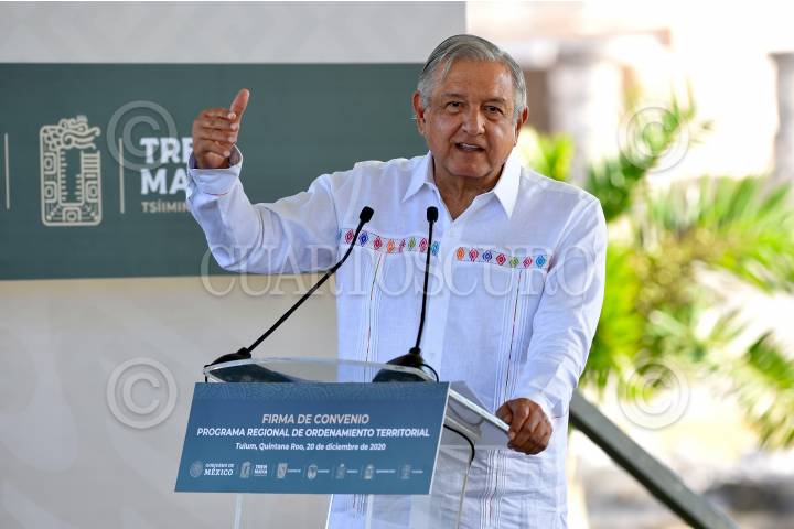 TULUM, QUINTANA ROO, 20DICIEMBRE2020.- Andrés Manuel López Obrador, Presidente de México encabezó la firma de convenio "Programa Regional de Ordenamiento Territorial en la Zona Arqueológica de Tulum". Lo acompañaron: Luis Cresencio Sandoval González, secretario de la Defensa Nacional; María Luisa Albores González, secretaria de Medio Ambiente y Recursos Naturales; Jorge Arganis Díaz Leal, secretario de Comunicaciones y Transportes; Román Guillermo Meyer Falcón, secretario de Desarrollo Agrario, Territorial y Urbano; Rogelio Jiménez Pons, director general del Fondo Nacional de Fomento al Turismo (Fonatur); Carlos Miguel Aysa González, gobernador de Campeche; Rutilio Escandón Cadenas, gobernador de Chiapas; Carlos Manuel Joaquín González, gobernador de Quintana Roo; Adán Augusto López Hernández, gobernador de Tabasco; Mauricio Vila Dosal, gobernador de Yucatán; Víctor Mas Tah, presidente municipal de Tulum; Eduardo López Moreno, representante de ONU-Hábitat México (testigo de honor). FOTO: PRESIDENCIA/CUARTOSCURO.COM