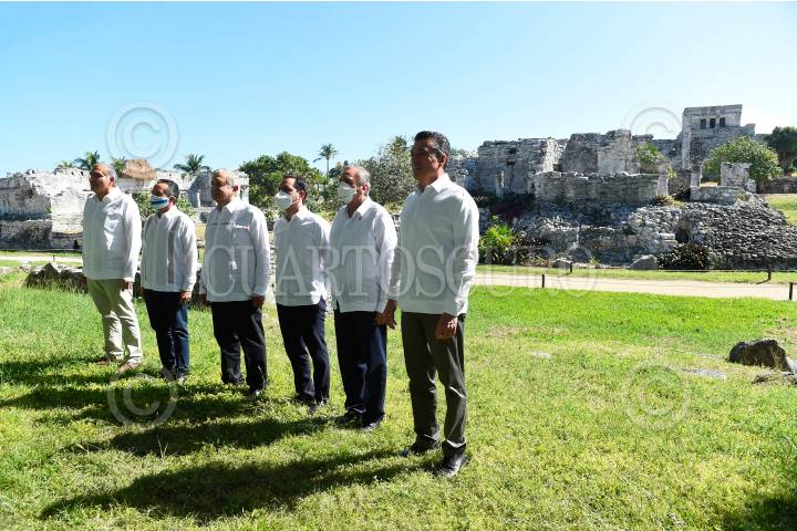 TULUM, QUINTANA ROO, 20DICIEMBRE2020.- Andrés Manuel López Obrador, Presidente de México encabezó la firma de convenio "Programa Regional de Ordenamiento Territorial en la Zona Arqueológica de Tulum". Lo acompañaron: Luis Cresencio Sandoval González, secretario de la Defensa Nacional; María Luisa Albores González, secretaria de Medio Ambiente y Recursos Naturales; Jorge Arganis Díaz Leal, secretario de Comunicaciones y Transportes; Román Guillermo Meyer Falcón, secretario de Desarrollo Agrario, Territorial y Urbano; Rogelio Jiménez Pons, director general del Fondo Nacional de Fomento al Turismo (Fonatur); Carlos Miguel Aysa González, gobernador de Campeche; Rutilio Escandón Cadenas, gobernador de Chiapas; Carlos Manuel Joaquín González, gobernador de Quintana Roo; Adán Augusto López Hernández, gobernador de Tabasco; Mauricio Vila Dosal, gobernador de Yucatán; Víctor Mas Tah, presidente municipal de Tulum; Eduardo López Moreno, representante de ONU-Hábitat México (testigo de honor). FOTO: PRESIDENCIA/CUARTOSCURO.COM