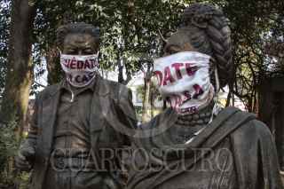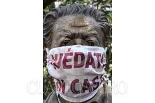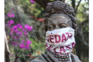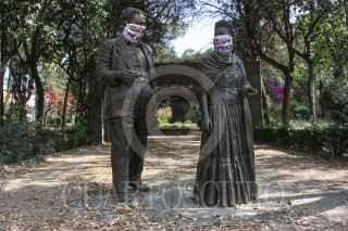 CIUDAD DE MÉXICO, 23DICIEMBRE2020.- Las estatuas de bronce de los artistas mexicanos, Frida Khalo y Diego Rivera, portan un cubrebocas con la frase "Quédate en Casa", esto como parte de la campaña de uso de cubrebocas y a la recomendación de permanecer en los hogares. Cabe mencionar que en el parque que lleva el nombre de la pintora, se utiliza como sede de un Kiosco de la Salud en donde se realizan pruebas para la detección de COVID-19 a los vecinos o transeúntes de la alcaldía Coyoacán. FOTO: ROGELIO MORALES /CUARTOSCURO.COM