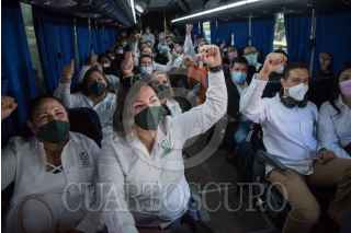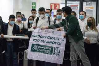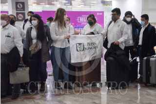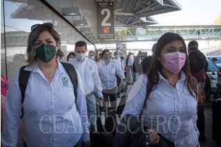 CIUDAD DE MÉXICO, 26DICIEMBRE2020.- Cuarenta y dos trabajadores del Instituto Mexicano del Seguro Social (IMSS) de Sonora durante su llegada en el Aeropuerto Internacional de la Ciudad de México para sumarse a la "Operación Chapultepec", para reforzar la atención médica durante la pandemia de covid-19. FOTO: MARIO JASSO/CUARTOSCURO.COM