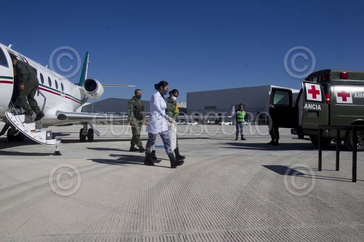 APODACA, NUEVO LEÓN, 28DICIEMBRE2020.- Las primeras mil 950 vacunas destinadas para el personal médico de Nuevo León, arribaron a la Fuerza Aérea Militar, las cuales fueron recibidas por el secretario de salud del estado, Manuel de la O Cavazos, posteriormente fueron trasladadas al Hospital Militar dentro de las instalaciones de la IV Región Militar. FOTO: GABRIELA PÉREZ MONTIEL / CUARTOSCURO.COM